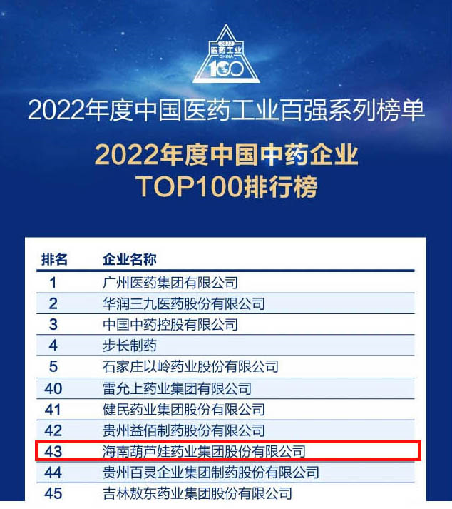 巅峰国际药业集团连续4年荣登“中国中药企业TOP100排行榜”,排名上升至第43位